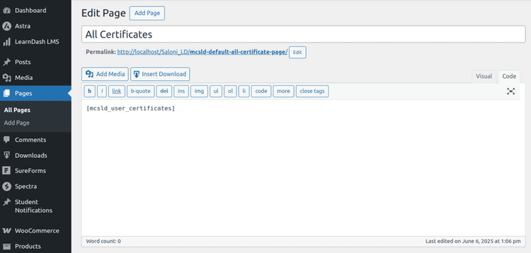 Head over to your WordPress dashboard > Pages. Navigate to ‘All Certificates’ page. Here, in the Code editor, you’ll need to enter the shortcode- [mcsld_user_certificates] and save it.