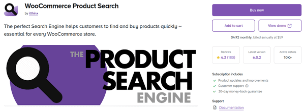 WooCommerce Product Search, developed by itthinx, is a robust WooCommerce search plugin that improves WooCommerce stores’ product search features. Customers can discover products quickly and effectively because of its rapid live search features.