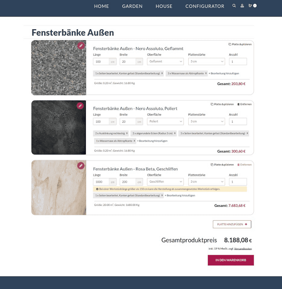 Our client is a leading tiles manufacturer and retailer based in Europe. They wanted a solution that allowed their customers to choose, configure and customize kitchen tops as per their needs and the total price is calculated based on the product and different configurable options chosen by them.