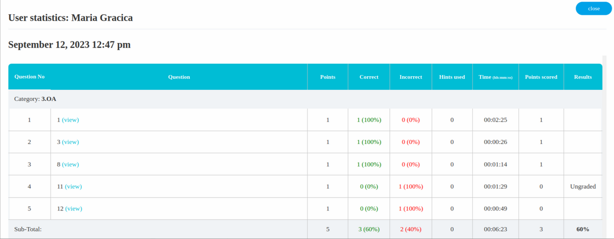 - So, we added an additional column which had a button. When this button is clicked it will show a popup to the teacher showing the entire result of the entire quiz question-by-question, so teacher can get a quick idea on what questions the student got wrong