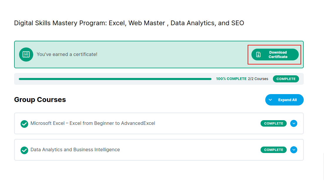 When a student completes all the courses associated with the group he/she will be able to download the certificates by clicking on download certificate button after which a pop up will appear to download the certificates.