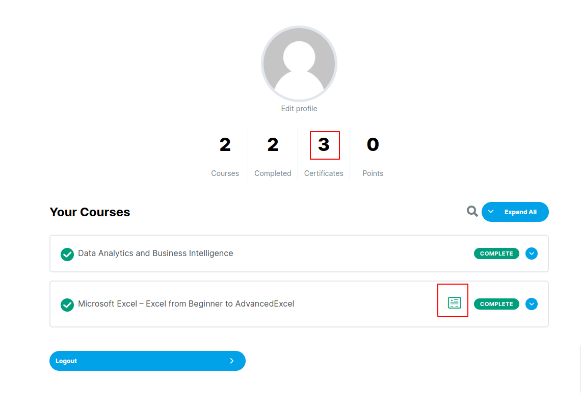 Count of the certificates will be updated on the students profile info also the certificates for each course can be downloaded from My Account Page itself.