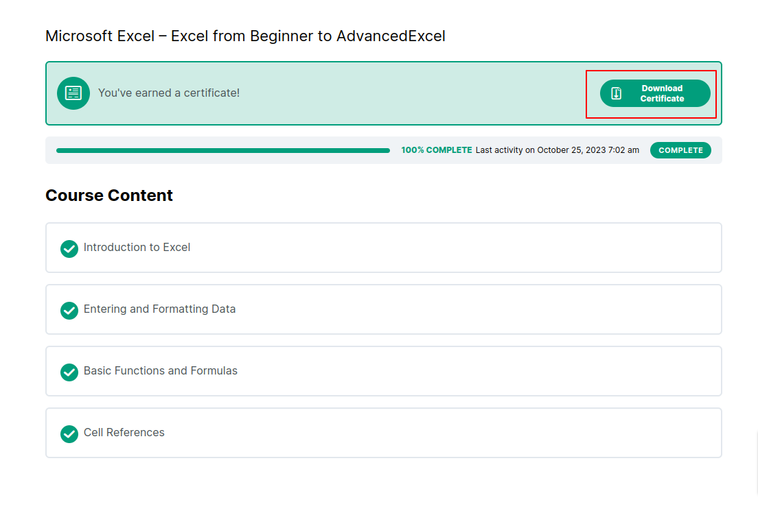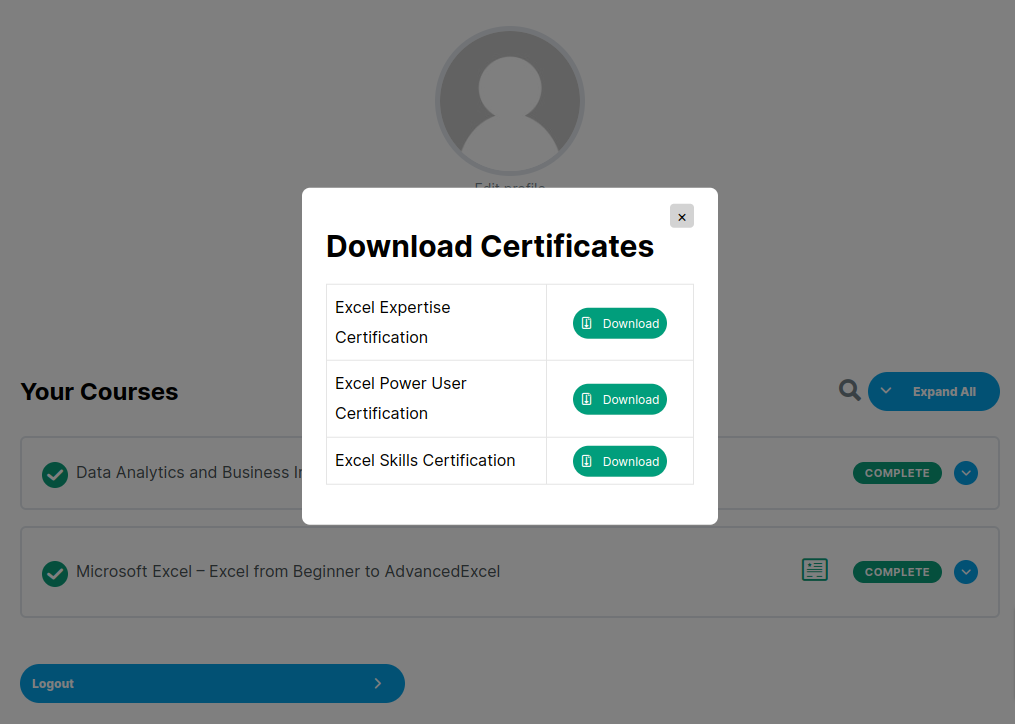When a student completes the course he/she will be able to download the certificates by clicking on Download Certificate button after which a pop up will appear to download the certificates.