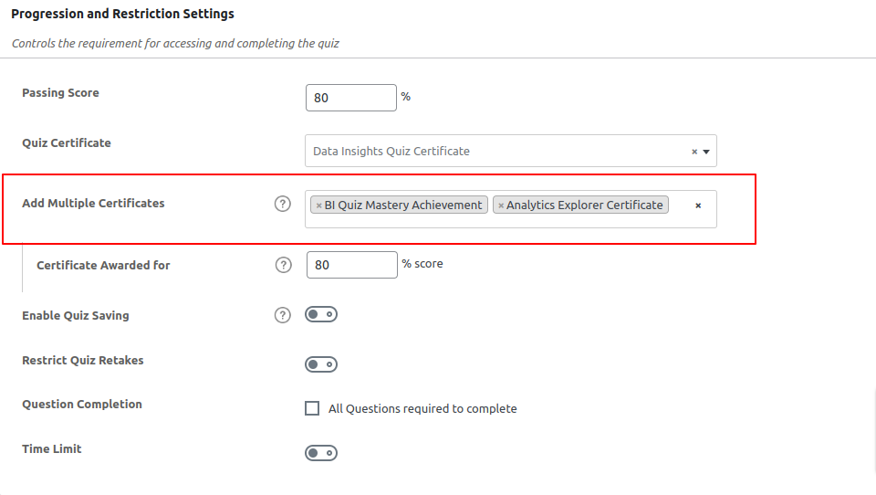 5. Once you have added a certificate in Quiz Certificate field you will get an Add Multiple Certificates field where you can add additional certificates to the course