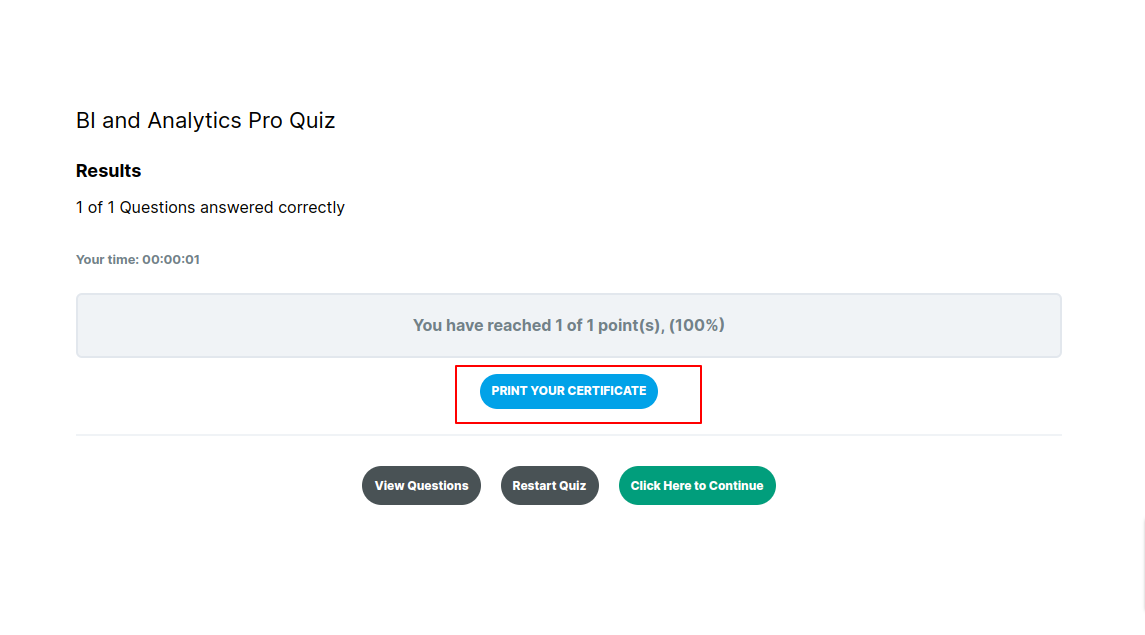 When a student completes a quiz he/she will be able download the certificates by clicking on PRINT YOUR CERTIFICATE button after which a pop up will appear to download the certificates.
