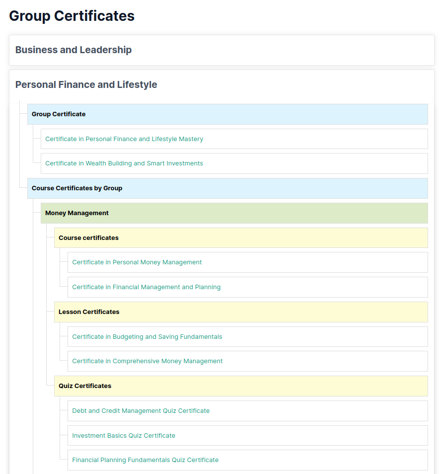 - Group-based Certificates – Certificates awarded for completing a group of courses.