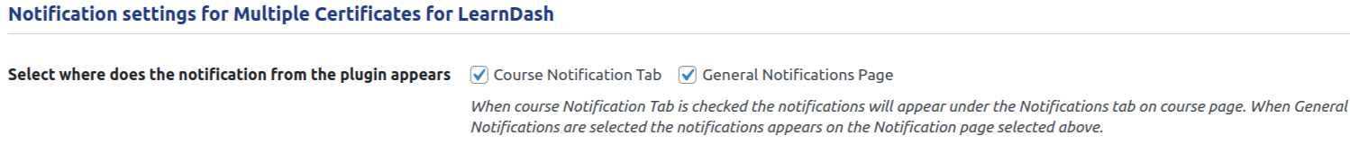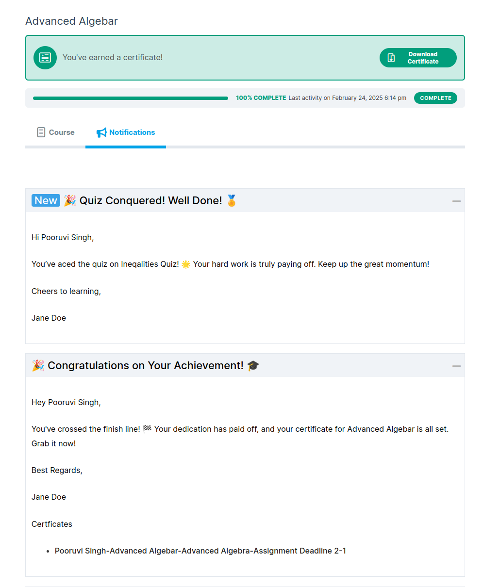 Multiple Certificates Pro for LearnDash now seamlessly integrate with Student Email Notifications for LearnDash. All email notifications issued by the plugin are readily accessible under the ‘Notifications’ tab on each course page, as well as on a comprehensive General Notifications page. This ensures that students can easily access their notifications either under their specific course or on a central page, preventing them from missing important updates.