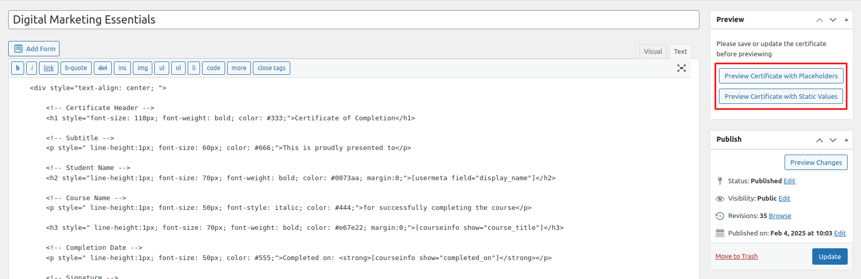 Now, the admin can preview the certificate directly on the Edit Page using a new meta field “Preview” located at the top-right corner of the edit page.
