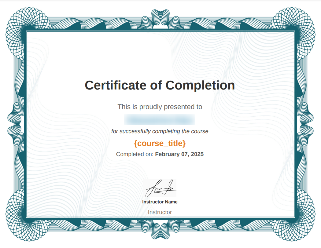 - In this preview mode, shortcodes within the certificate will be replaced with placeholders. Example, [courseinfo show=”course_title”] will replace with “{course_title}”