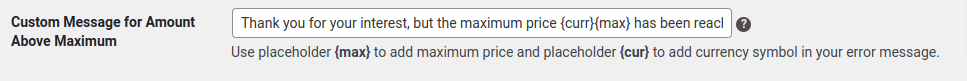 These placeholders dynamically replace with the actual currency symbol and price limits associated with the specific product.