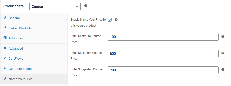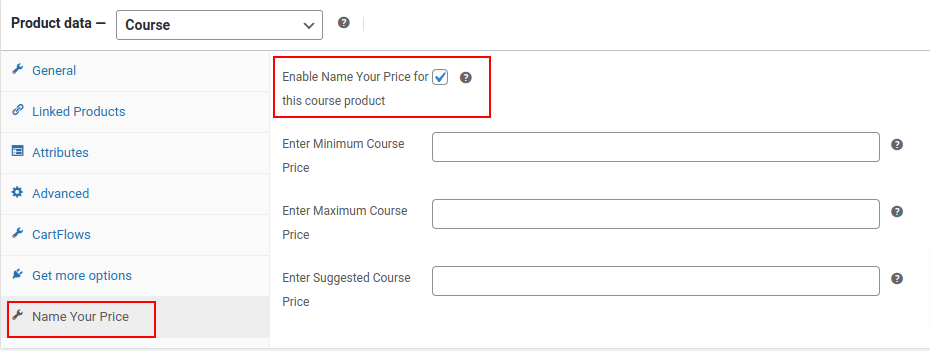 - Check the checkbox labelled “ Enable Name Your Price for this course product”