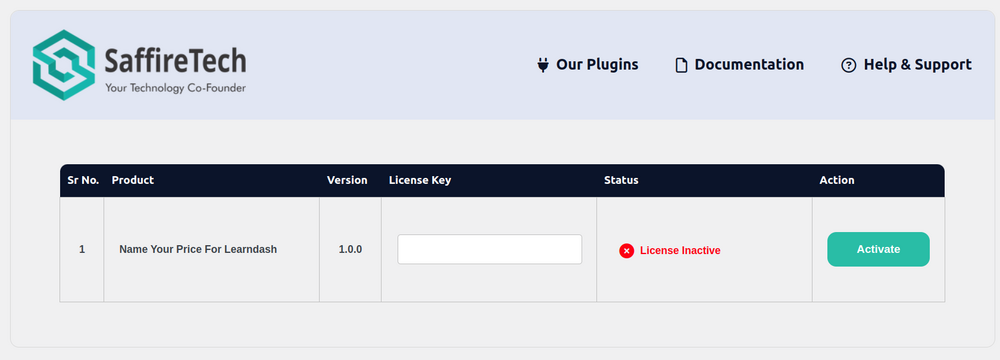- In the admin area navigate to SaffireTech License menu and you will get the SaffireTech License Page.