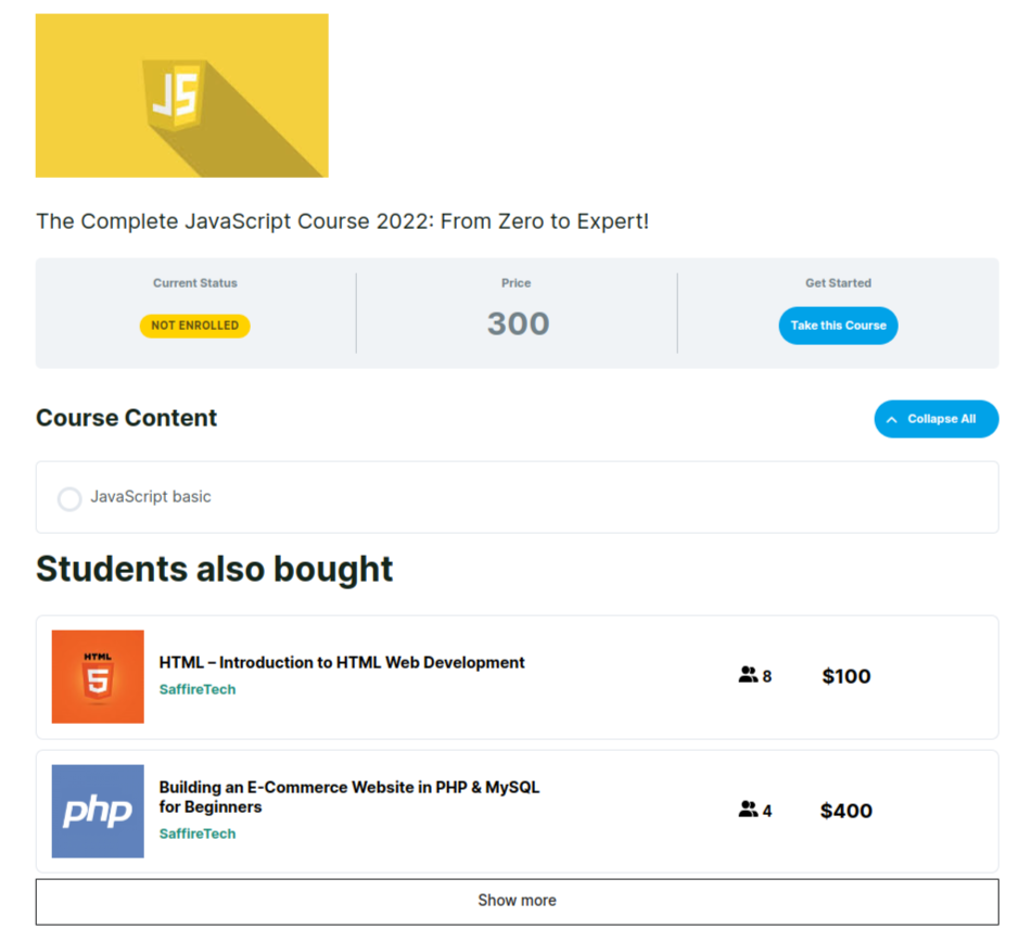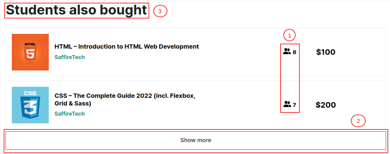 2) Enable ‘Show More’ button: If you have multiple courses that you would like to UpSell then enabling this setting will allow you to show the UpSells courses list in 2 parts. In the first part, the visitor will see the list of related courses by default, and the second list is shown after the visitor clicks on ‘Show more’. Basically, allowing you to list as many courses for UpSells without taking up a lot of space. If you disable this setting, then the UpSell widget will show all the courses in a single list.