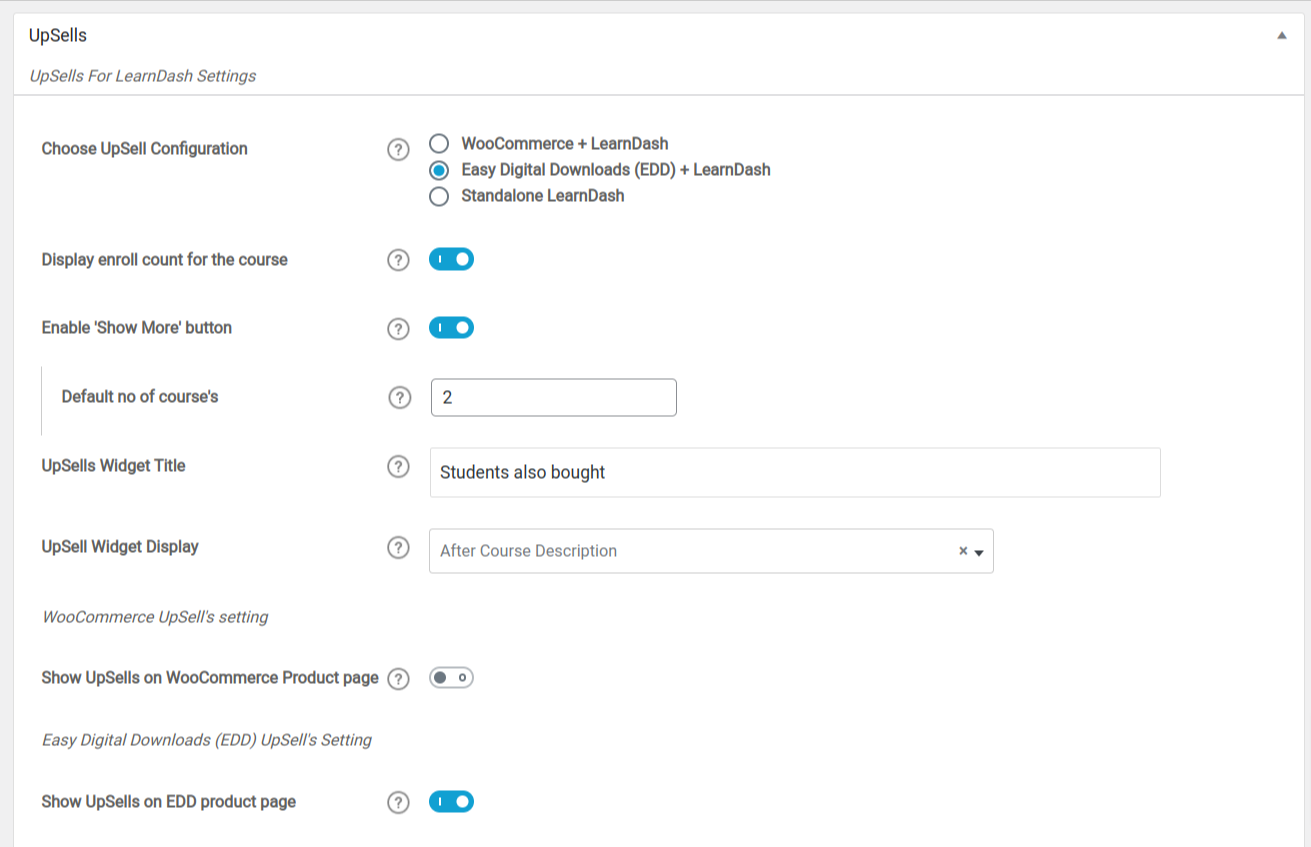 Show UpSells on EDD product page: Enabling this setting will set the UpSells for the corresponding EDD product page that is associated with your LearnDash course and display the UpSells courses list on the EDD product page.