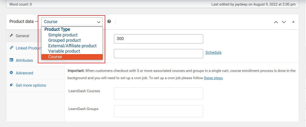 - Now in LearnDash Meta box in courses settings select one learndash course that you want to be linked with current product