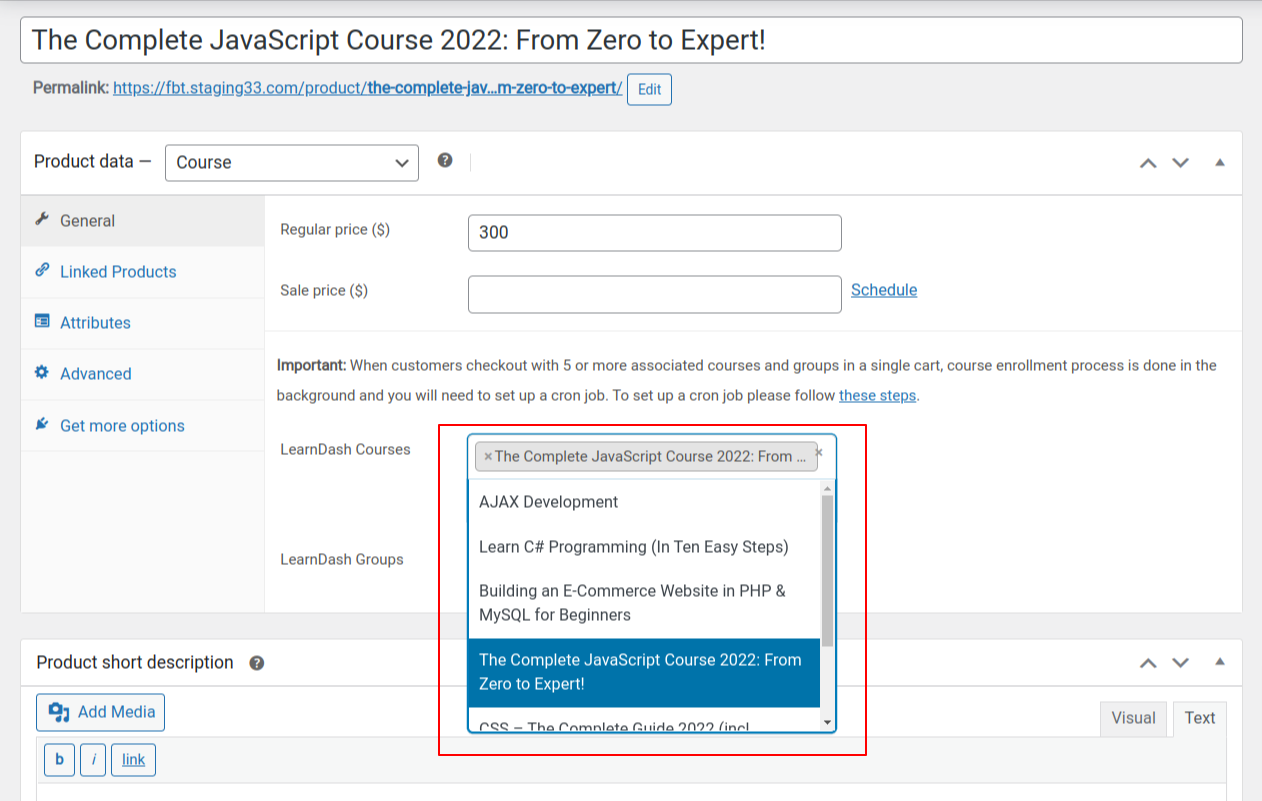 - Now in LearnDash Courses multi-select box select only one-course name that wants to link the current product and update that product