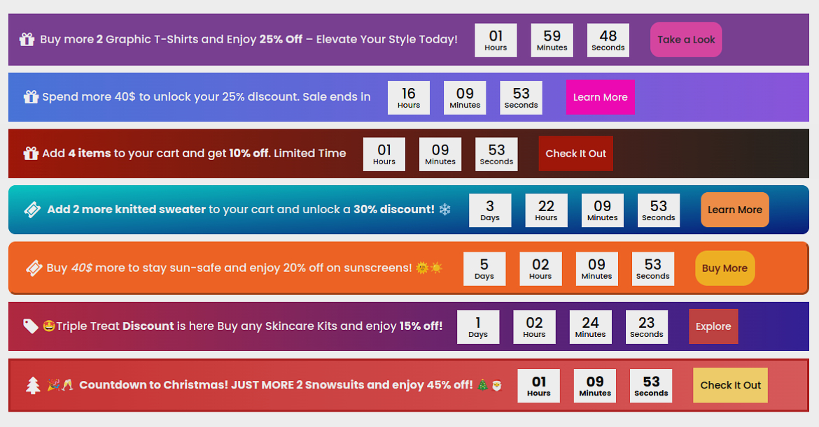 For example, during the holiday season, you can display a message like, “Add one more holiday-themed item to your cart and receive a free gift!”