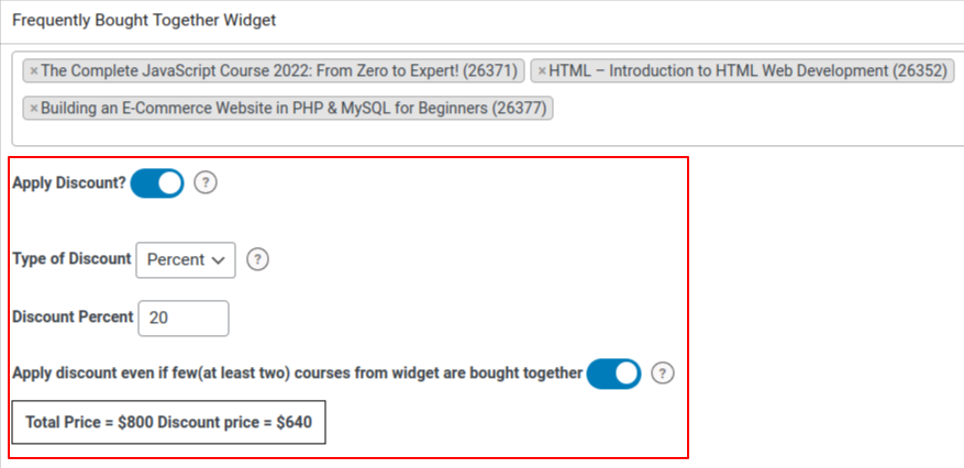 One of the most powerful features of the ‘Frequently Bought Together for LearnDash’ plugin is its ability to offer discounted course bundles. If you’re promoting a group of related courses, you can use the plugin to showcase these courses as a bundle and incentivize purchases by offering a discount when bought together.