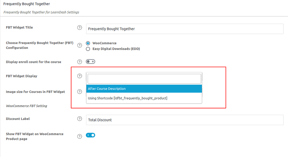 You have options to display the FBT widget either below the course description or anywhere on the LearnDash course page using a shortcode. This gives you full control over widget placement.
