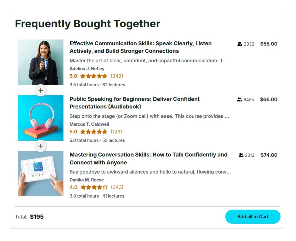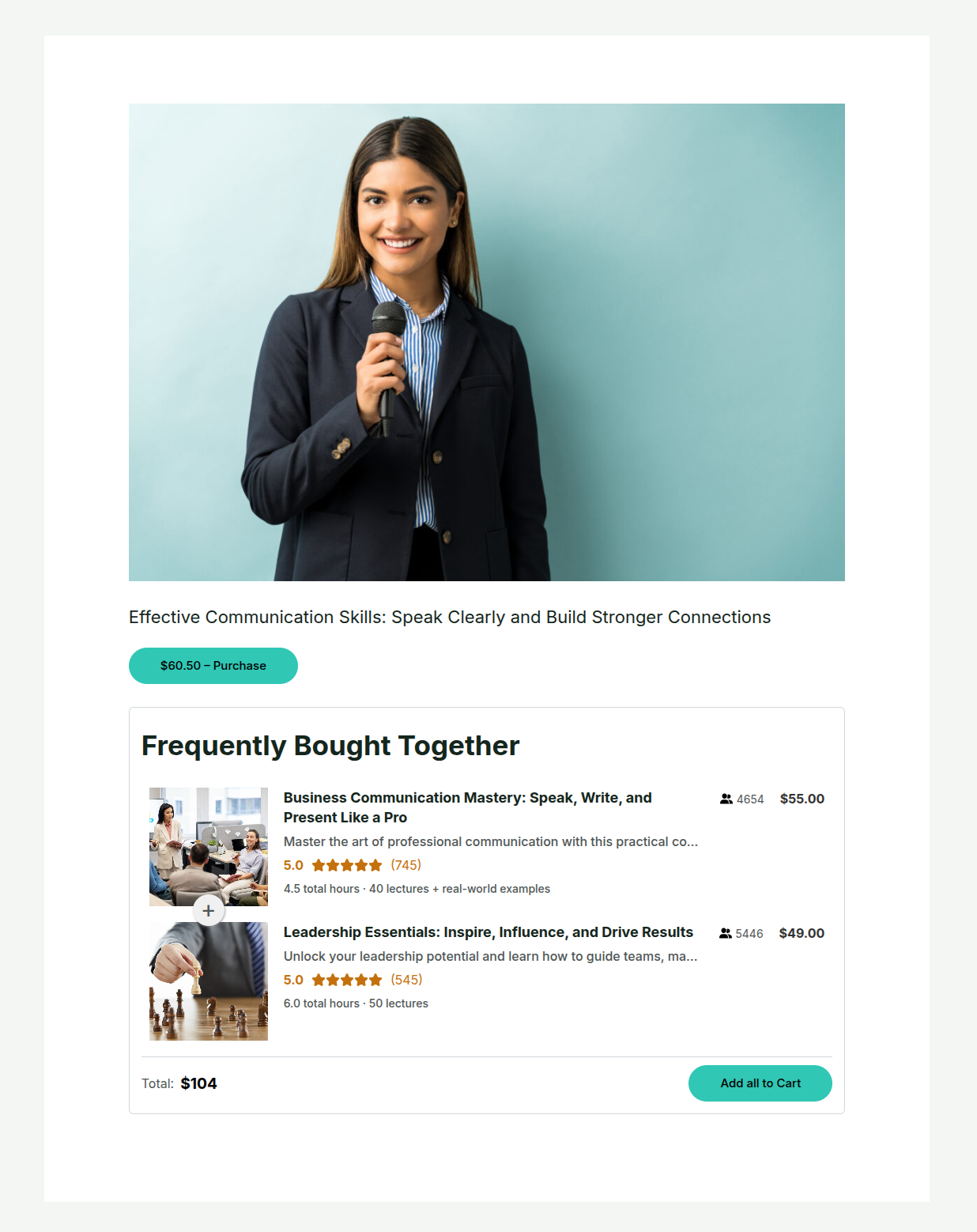 When students view a course, the frequently bought together plugin helps them discover other relevant courses through the widget.