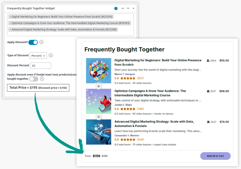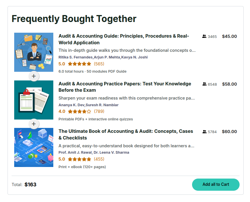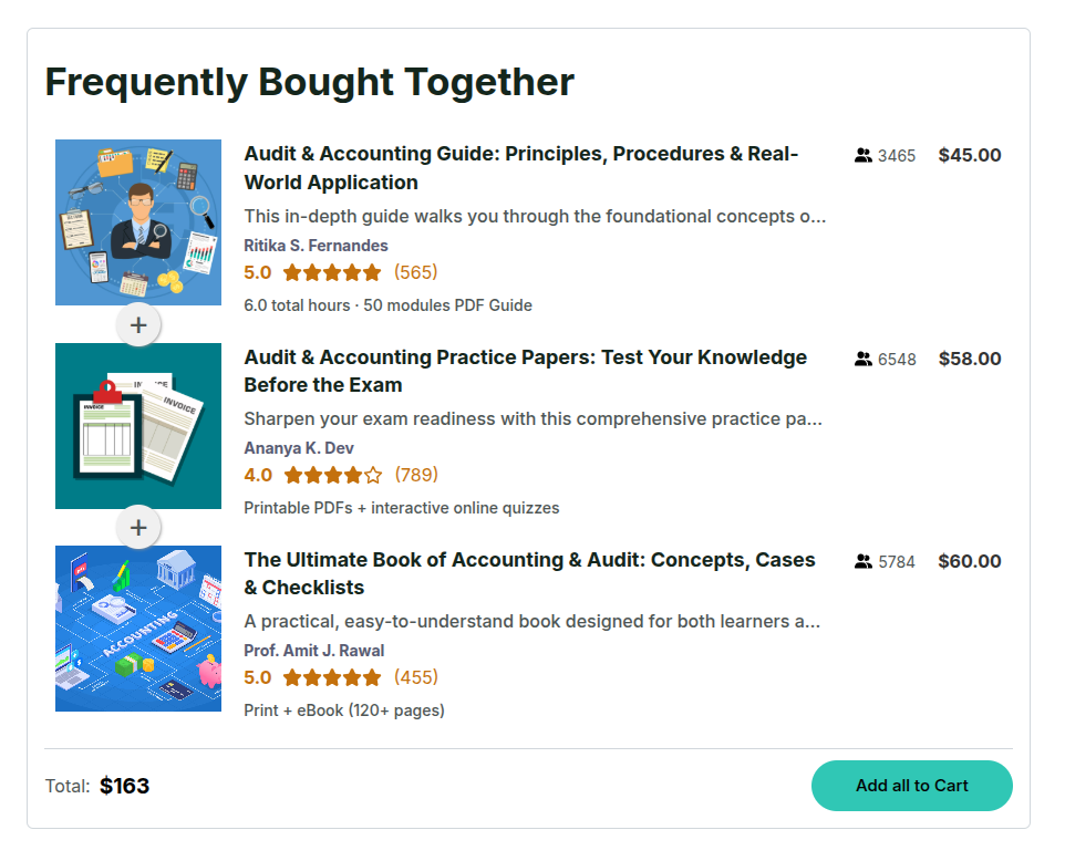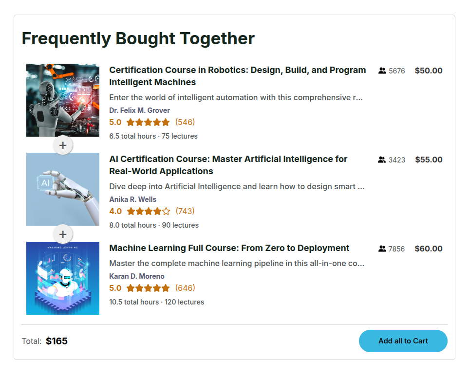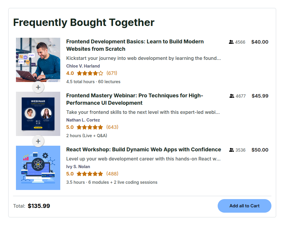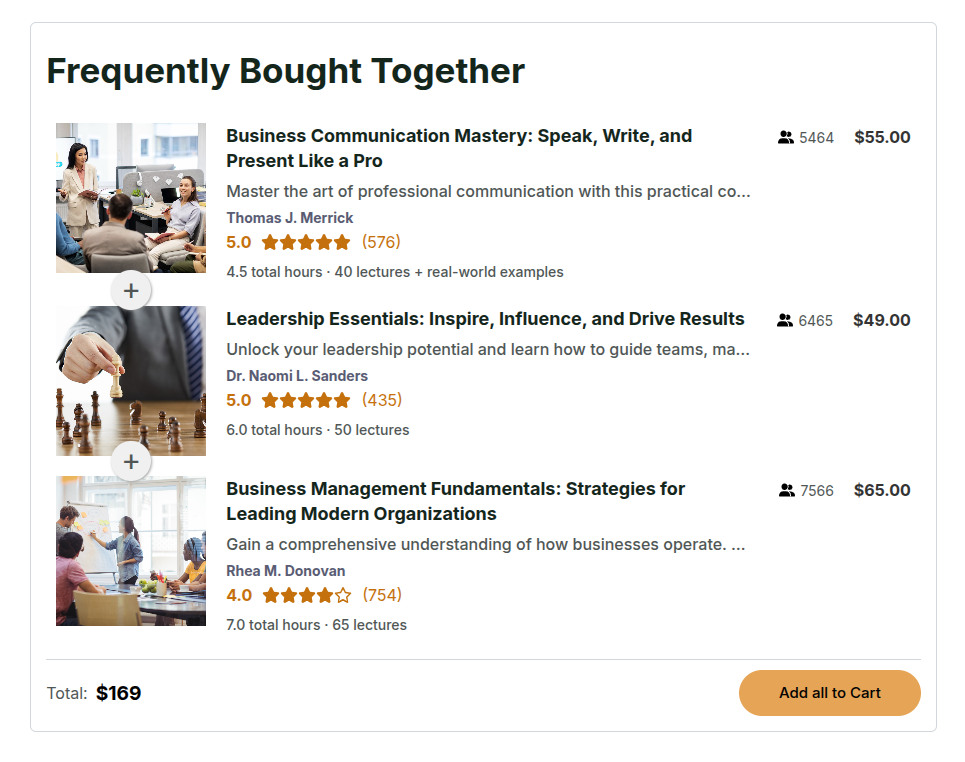 With just a few clicks, the frequently bought together plugin lets you configure the ‘Frequently Bought Together’ section across your entire course catalog.