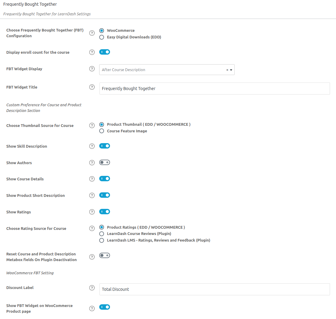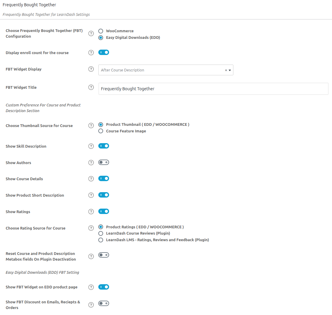 With the frequently bought together plugin, you can effortlessly set up the ‘Frequently Bought Together’ section for each course. After linking all LearnDash courses with their respective WooCommerce or EDD product listings, simply configure this section from the backend in just one click.