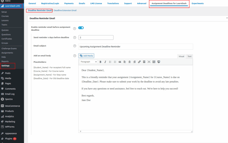 LearnDash LMS → Settings → Assignment Deadlines for LearnDash → Deadline Extension Email.