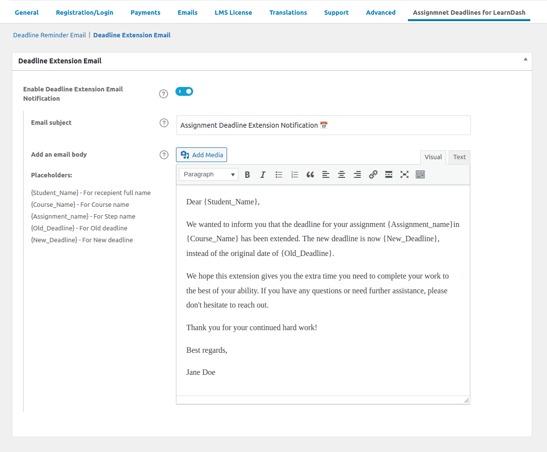 Effortlessly notify students about deadline changes when extending assignment deadlines. With Assignment Deadlines Pro for LearnDash, you can send personalized emails informing learners of their new submission dates.