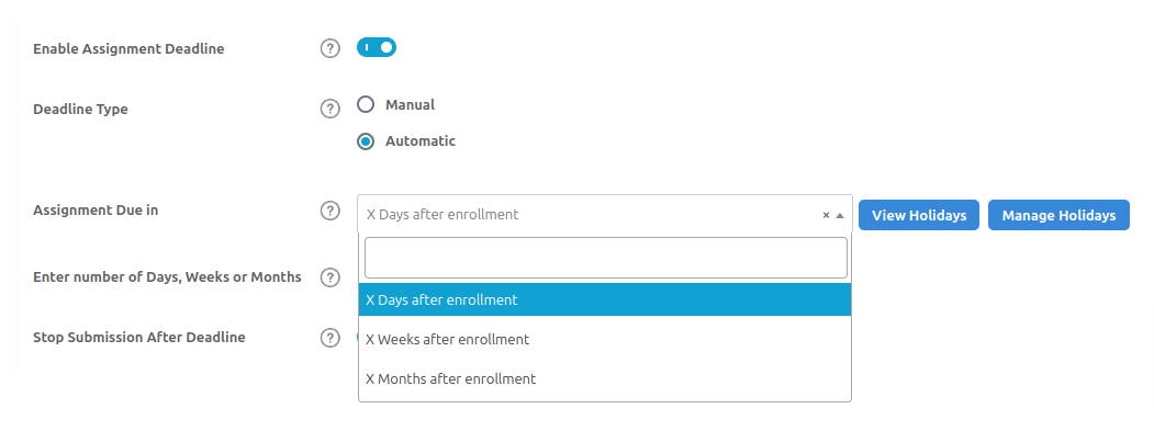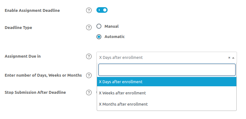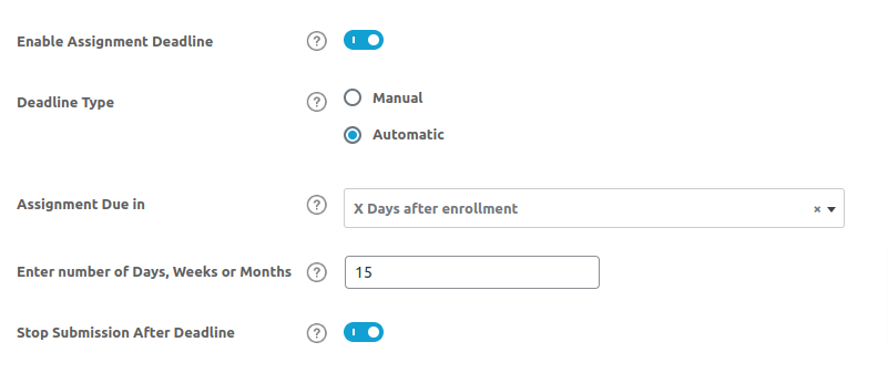 By enabling an “automatic deadline” the deadline will automatically be adjusted according to the enrollment date of the student into the course. For eg, if the deadline is set for 5 days after the enrollment date the assignment will be due exactly after 5 days of the student’s enrollment into the course.