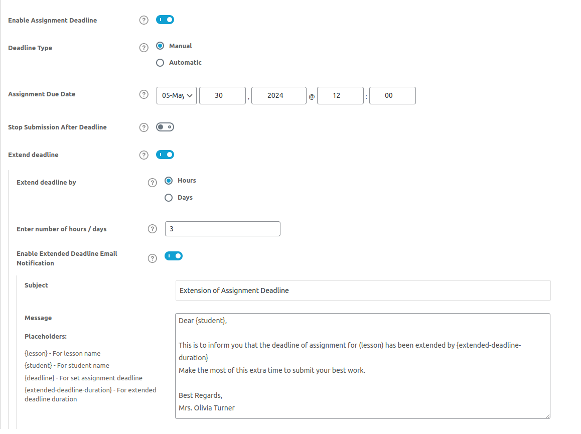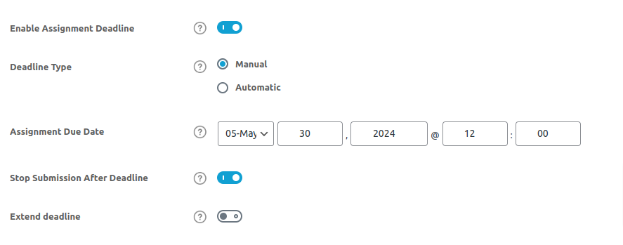Absolutely! This LearnDash assignment management plugin offers the flexibility to extend Manually added deadlines as needed. If you need to give your students extra time, you can easily adjust the deadline by adding more hours or days. This extension can be done directly from the assignment settings, ensuring that any changes are quick and hassle-free.