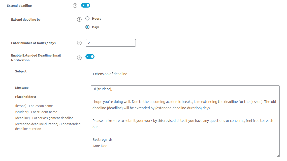 Whether extending by a few hours or several days, students receive clear communication, eliminating confusion and ensuring they stay on track. Imagine a scenario where a major holiday interrupts your course schedule. Instead of manually contacting each student, you can extend all assignment deadlines by a day or more with a single action.