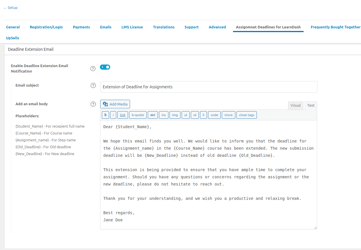 The Assignments Deadline for LearnDash plugin includes a feature to automatically notify students via email about any deadline extensions. These notifications are customizable, allowing you to add your own message or details. This ensures that all students are kept up-to-date with the latest information regarding their LearnDash assignments.