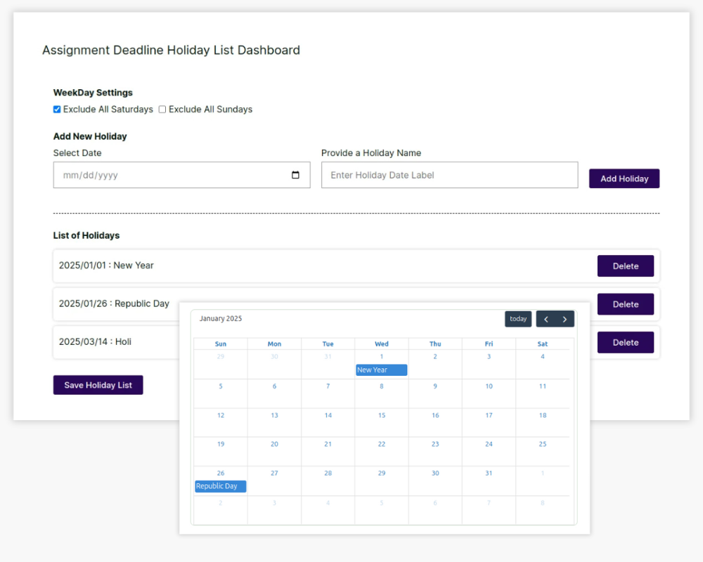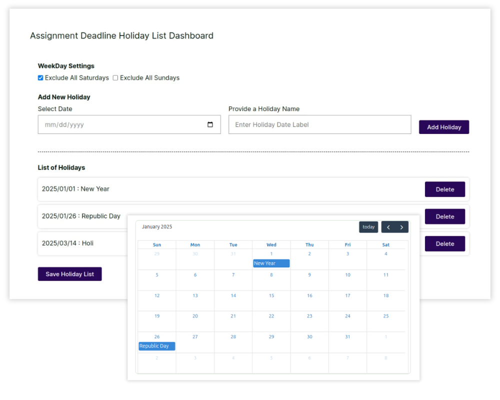 The Holiday List for Dynamic Deadlines feature simplifies deadline management by factoring in holidays and weekends. You can configure global settings to exclude Weekends or add custom holidays through an intuitive dashboard. When setting dynamic deadlines, the system automatically skips these excluded dates, ensuring realistic due dates.This smart, customizable tool saves time, avoids scheduling conflicts, and ensures deadlines are fair and practical for everyone.