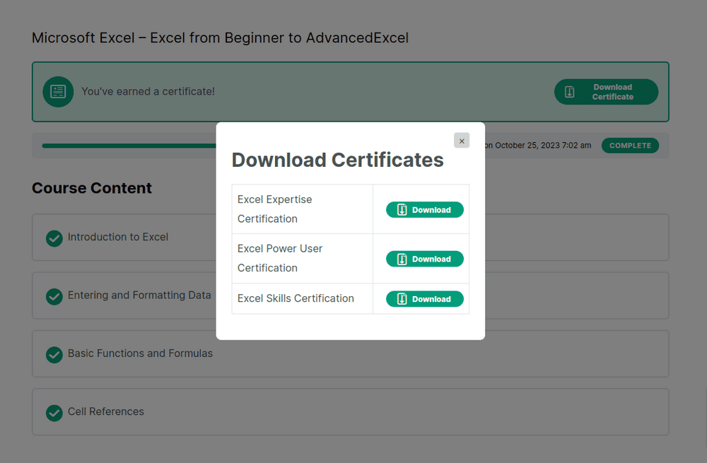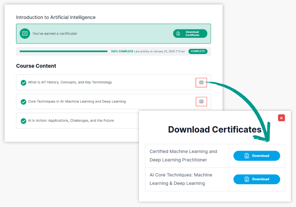 Certificates are neatly categorized, making it effortless to track accomplishments and download them when needed. A streamlined way to keep learning milestones organized and accessible!