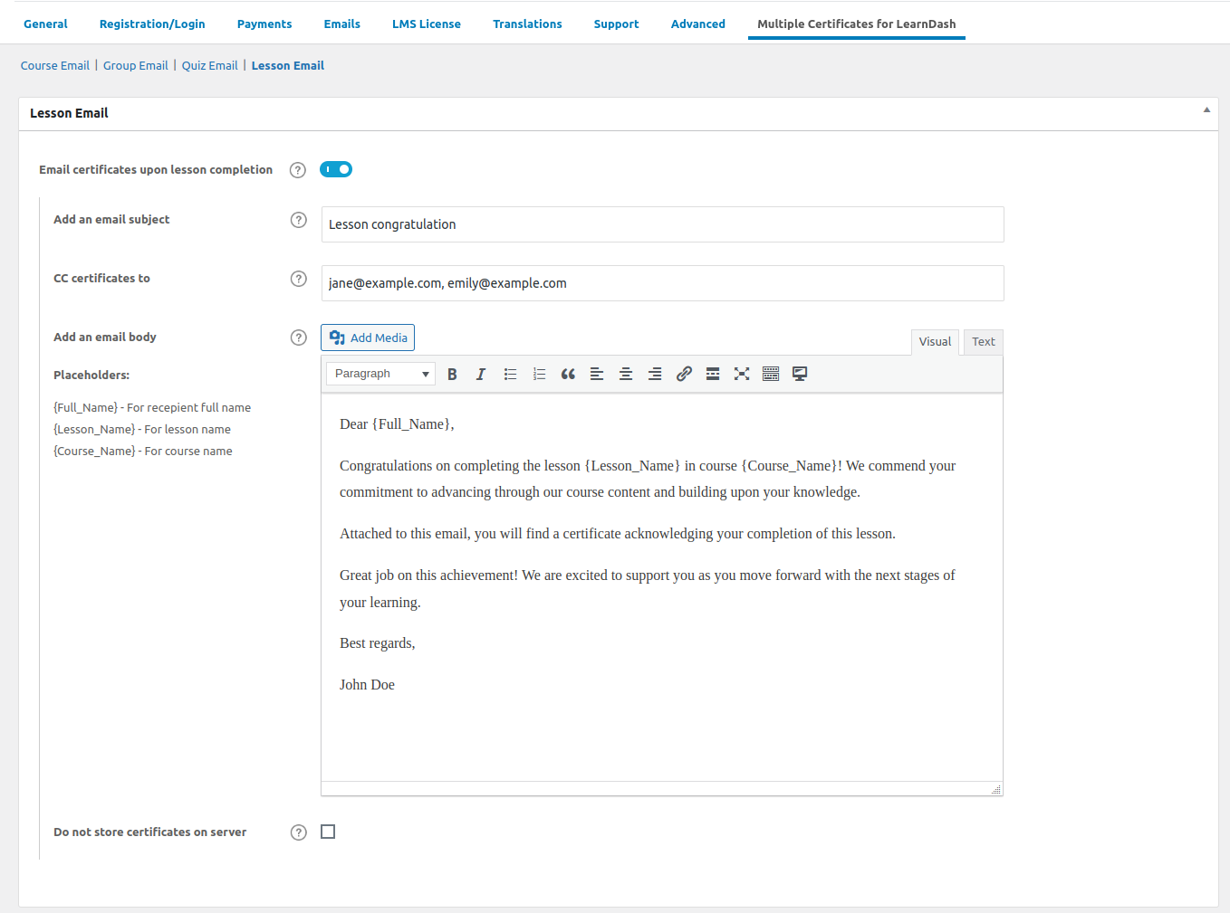Admins can enable emailing of certificates by accessing the plugin settings which can be found under LearnDash settings -> Multiple certificates for LearnDash, there will be separate tabs to enable certificate emailing for each type of completion (course, quiz, lesson, or group). Once enabled, the admin can customize the email body, add a subject, and specify a CC list for the emails.