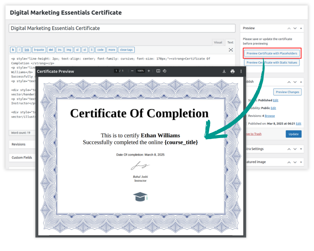 With the new Certificate Preview feature, you can now preview LearnDash certificates before issuing them. Choose “Preview with Placeholders” to see how shortcodes will appear dynamically, or “Preview with Sample Values” to visualize a certificate with sample data. This makes designing and verifying certificates easier, ensuring a polished final version before students receive them!