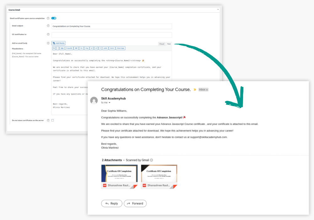 You can enable emails that are sent automatically to the students with the certificates earned by them for every course, quiz, group, and/or lesson completion. These certificates are also saved to the server by default but also come with an option to turn off saving if you wish to.