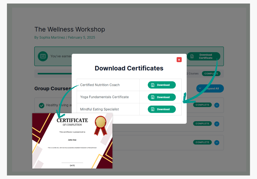 After completing the required courses, group courses or quiz, students can access their certificates from their profile. Certificates for the lessons, can be accessed from the main course page.