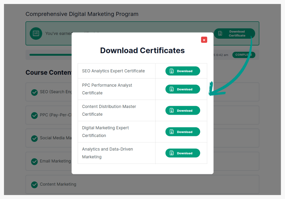 For a course that covers multiple topics, such as a comprehensive digital marketing program, you can issue certificates for each module (e.g., SEO, PPC, social media).
