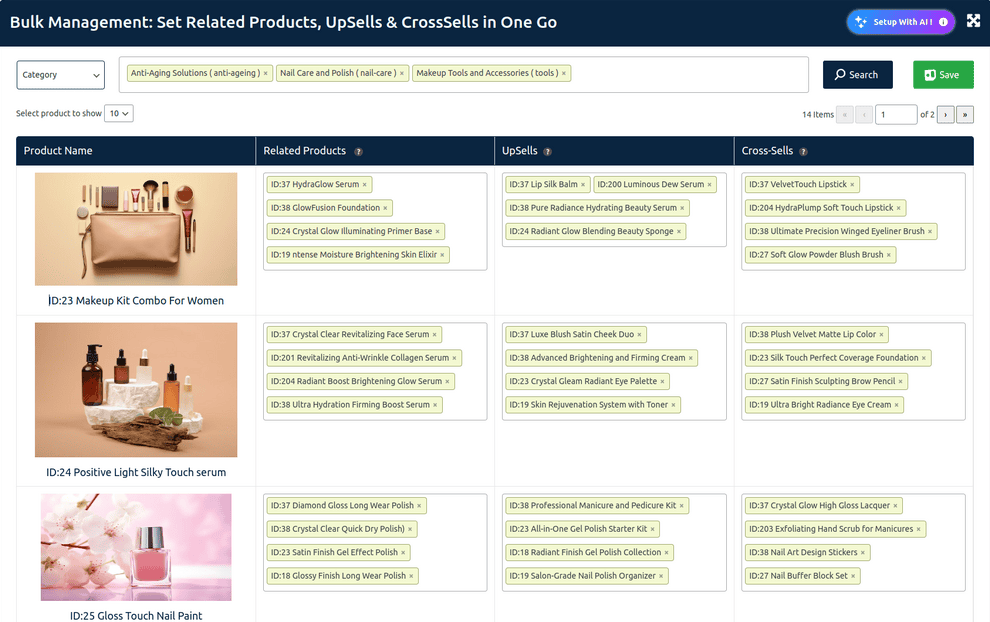With built-in AI-Powered Bulk Editing, simply write a prompt, and OpenAI (ChatGPT) will automatically assign related products, upsells, and cross-sells based on your instructions.