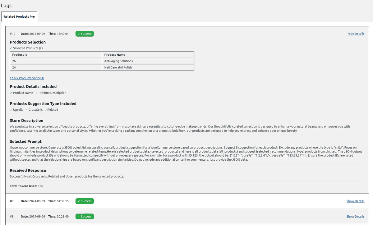 Stay in control of your store’s AI WooCommerce related products with the built-in log feature.